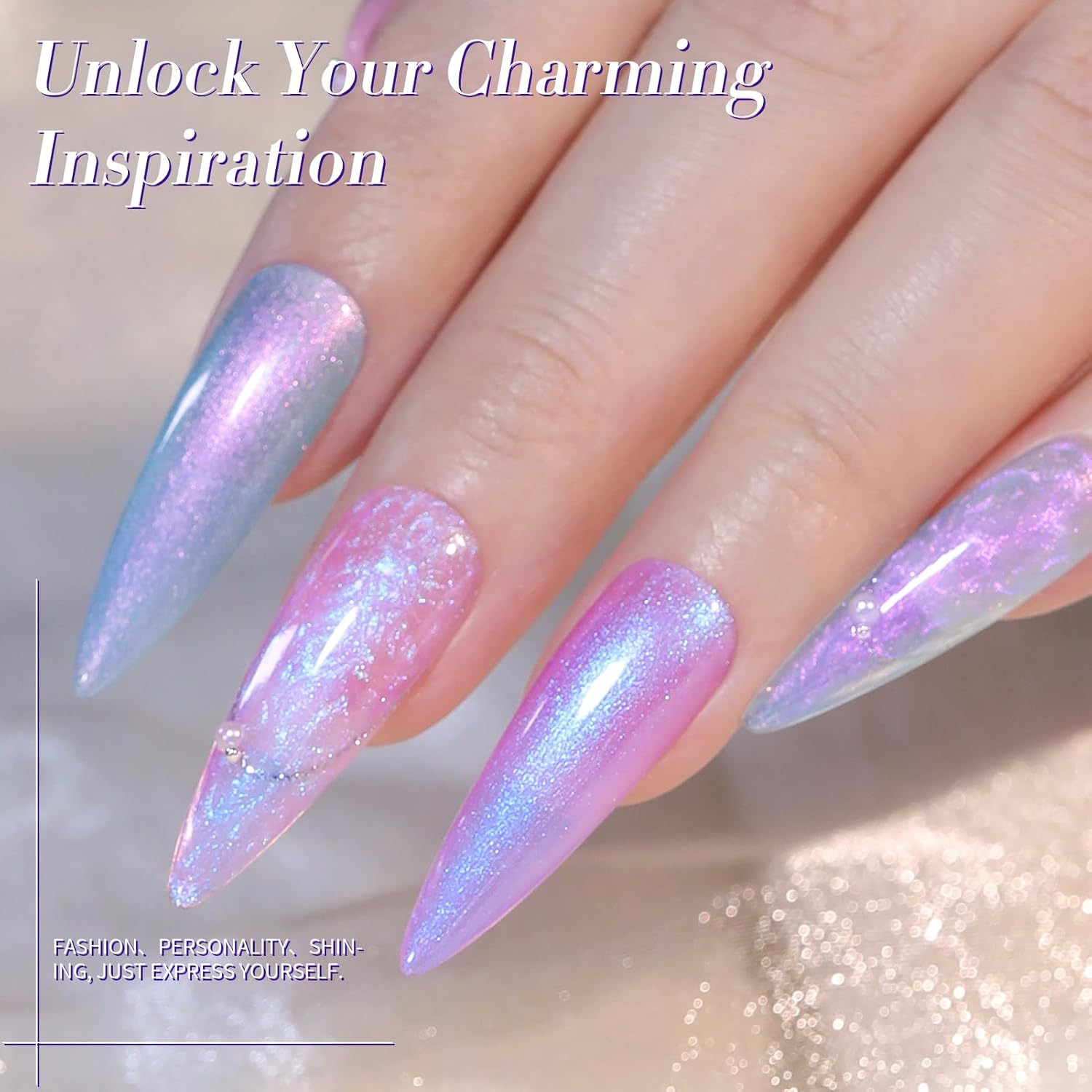 - [Pearl Mermaid and Swirl Thread Gel Polish Set]: This is 2-in-1 gel nail polish, it will get Swirl Shell Thread effect after you using the dotting pen(not include), and it is pearl mermaid effect without using the tool